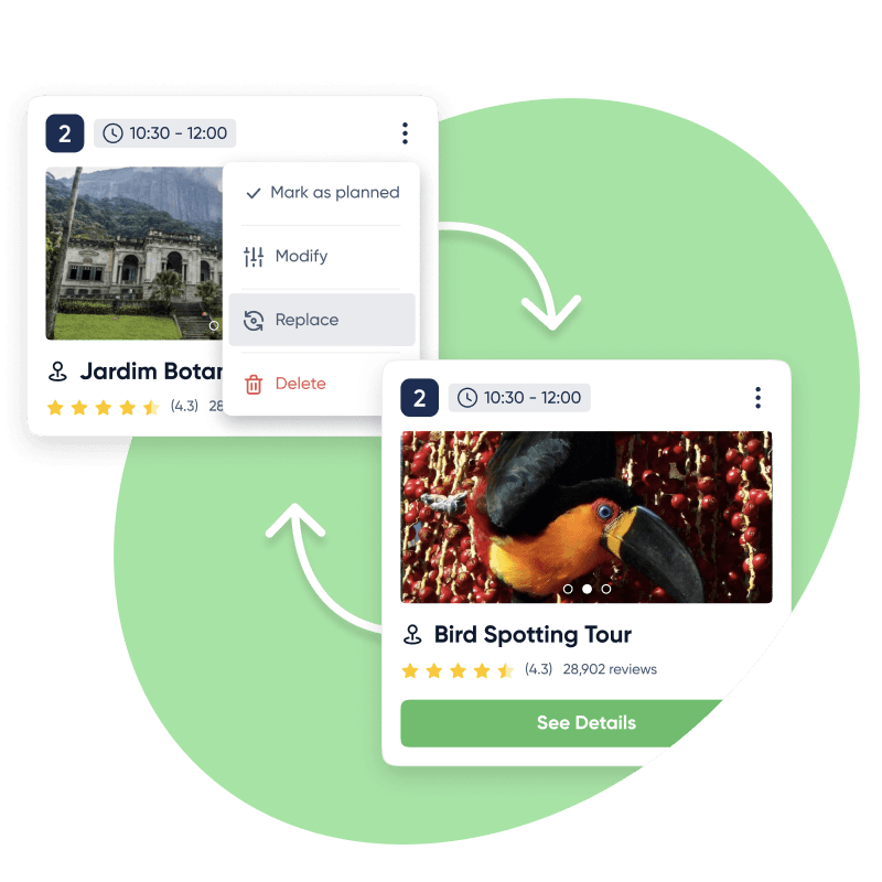 Change, modify or replace right on the spot, and get the best AI-recommendations based on the location and your preferences.